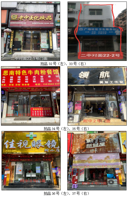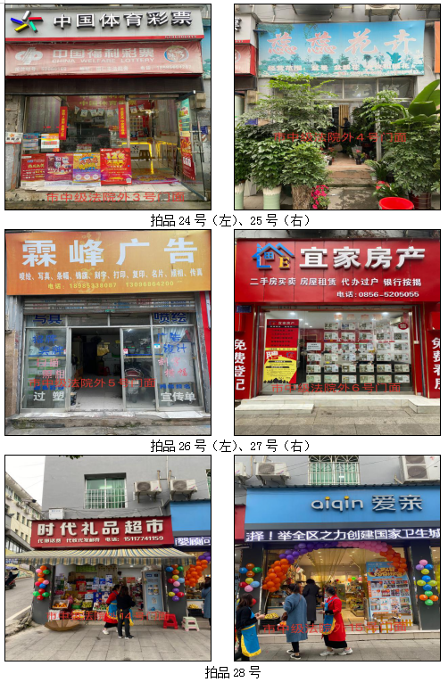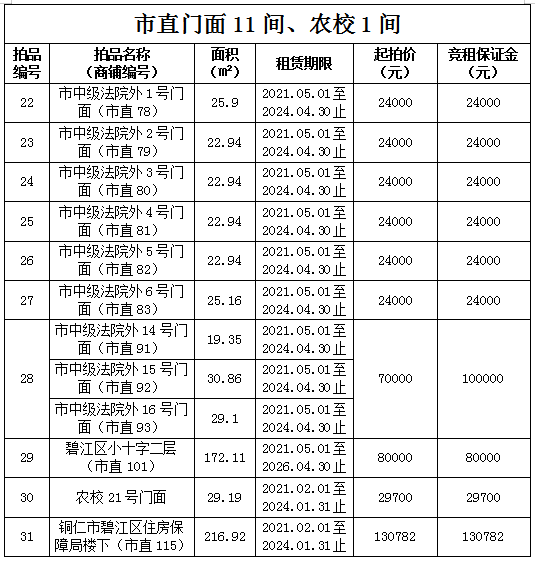 1.拍品22至28號標的位于銅仁市中級人民法院外,面積:19.35——30.86㎡,租賃期3年(2021.05.01至2024.04.30止),交通便利,其中28號標的包含3個門面(市直91號、92號和93號)為整體拍租。