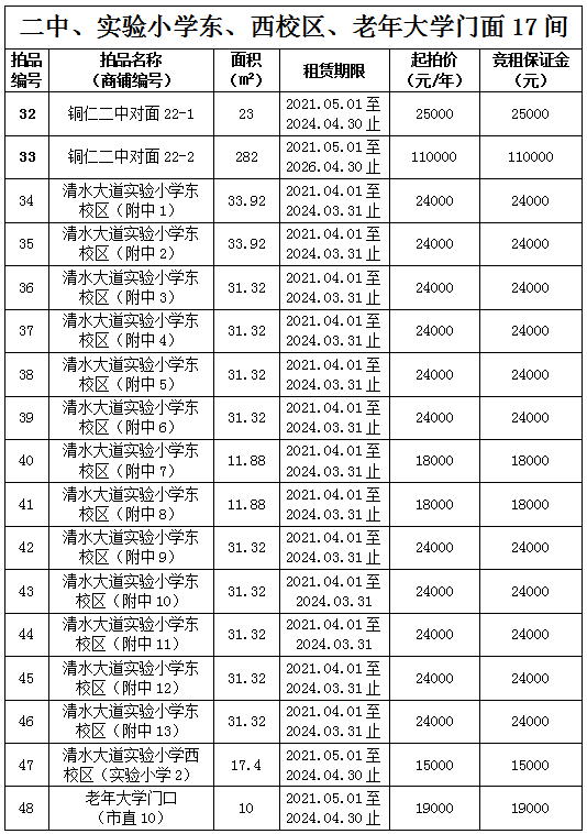 拍品34至46號標的位于銅仁市清水大道實驗小學東校區(qū),面積11.88——33.92㎡,租賃期3年(2021.04.01至2024.03.31止);