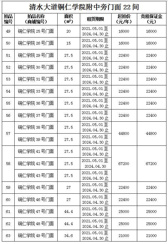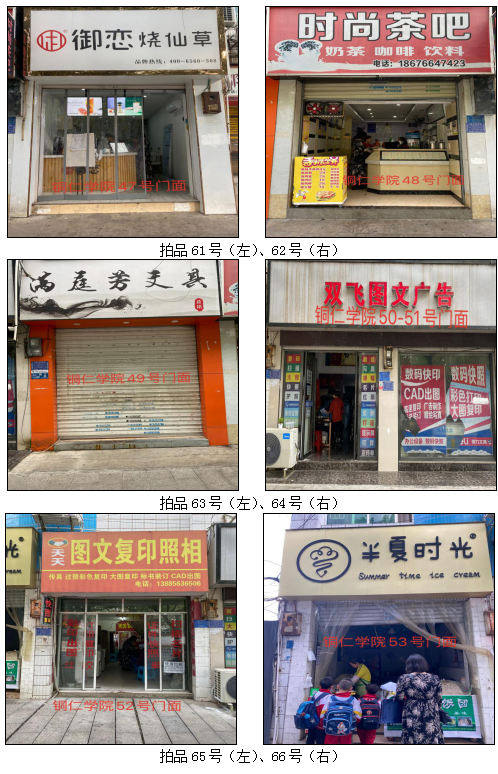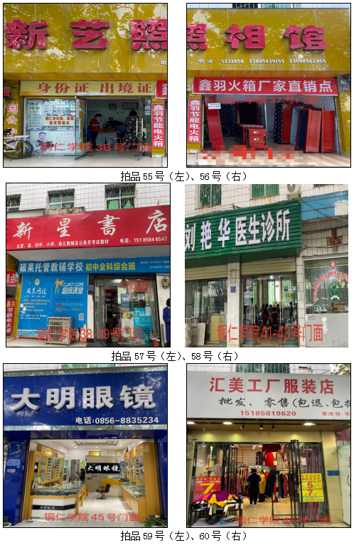 1.拍品49至66號標的位于銅仁市清水大道銅仁學院附中旁,面積15——44.4㎡,租賃期3年(2021.05.01至2024.04.30止),交通便利,人流量大。