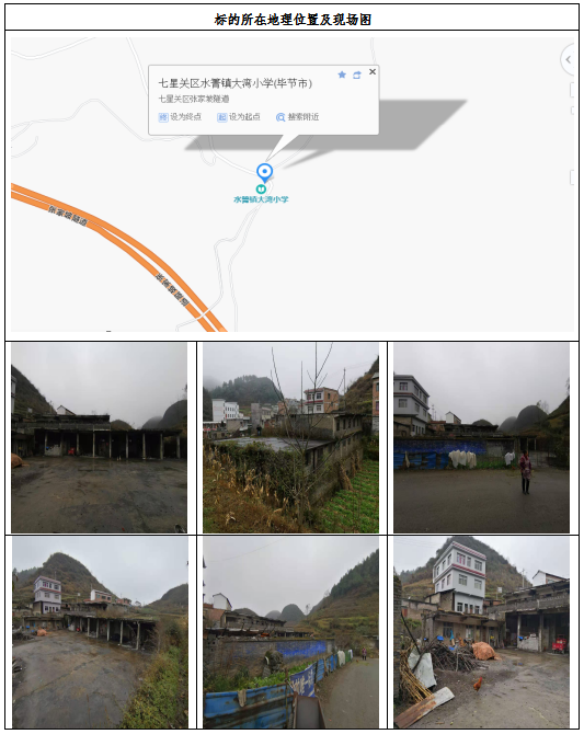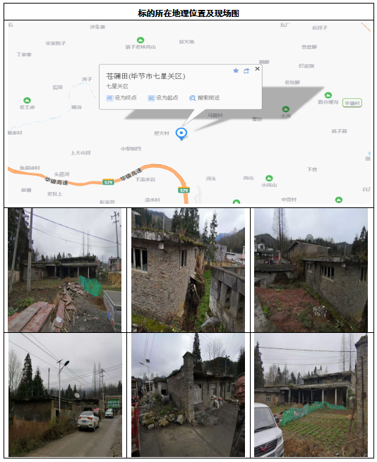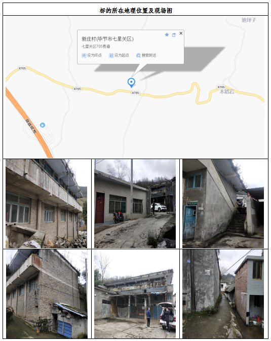 標的位于畢節(jié)市七星關(guān)區(qū)海子街鎮(zhèn)王張村,房屋總層數(shù)二層,建成于1991年。總建筑面積:987.15㎡,其中套內(nèi)建筑面積:910.31㎡,共有分攤面積:76.84㎡;土地面積:1414.92㎡,磚混結(jié)構(gòu),無房產(chǎn)證,國有土地使用證:畢市國用(95)字第23-001號,用途為:倉儲,土地性質(zhì)為:劃撥用地。