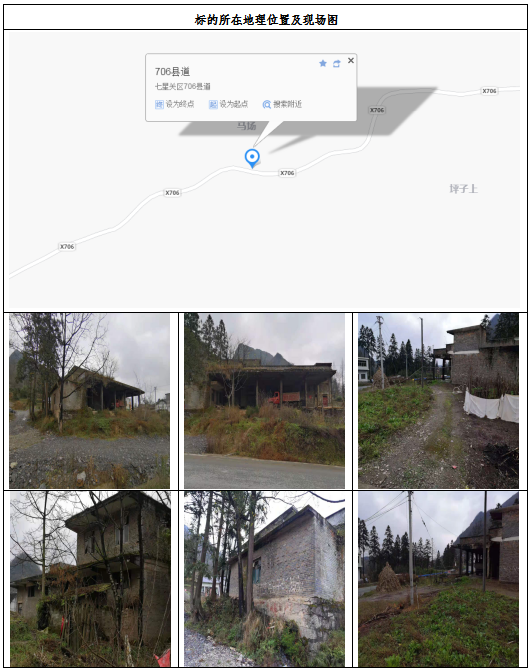 標的位于畢節(jié)市七星關(guān)區(qū)田壩鎮(zhèn)貓場村,房屋總層數(shù)二層,建成于1990年??偨ㄖ娣e:859.84㎡,其中套內(nèi)建筑面積:789.89㎡,共有分攤面積:69.95㎡;土地面積:743.21㎡,磚混結(jié)構(gòu),無房產(chǎn)證,國有土地使用證:畢市國用(95)字第13-002號,用途為:倉庫,土地性質(zhì)為:劃撥用地。