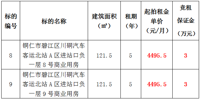 拍品8號和9號標的位于銅仁碧江區(qū)川硐汽車客運北站A區(qū)進站口負一層8-9號的商業(yè)房地產(chǎn),位于銅仁市中心以北,銅仁汽車北站安置旁,建筑面積分別為:121.5㎡、121.5㎡,租賃期5年,該標的位置交通便利,人流量大。