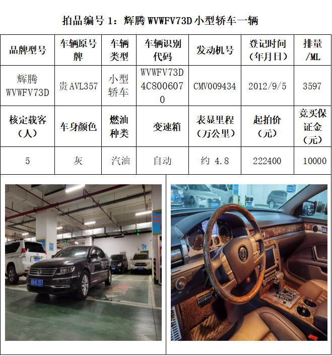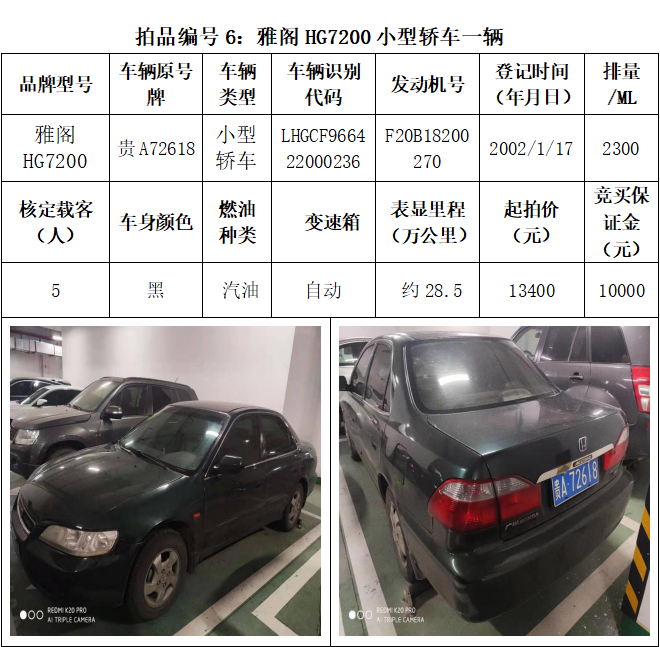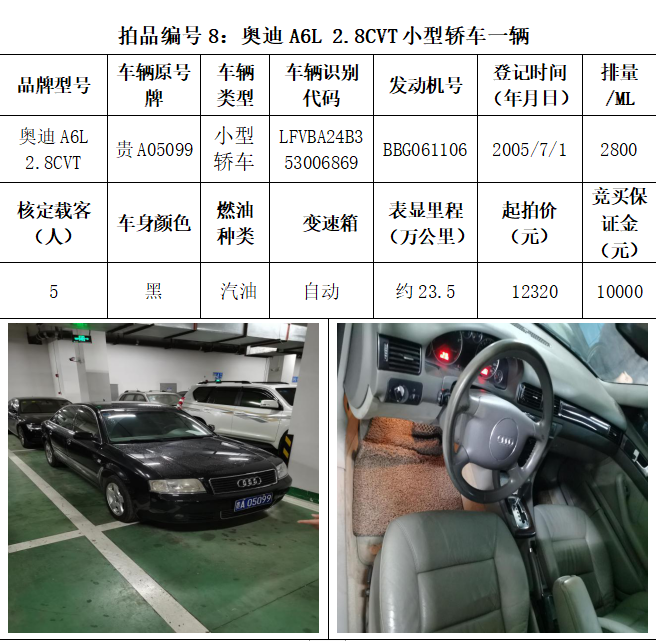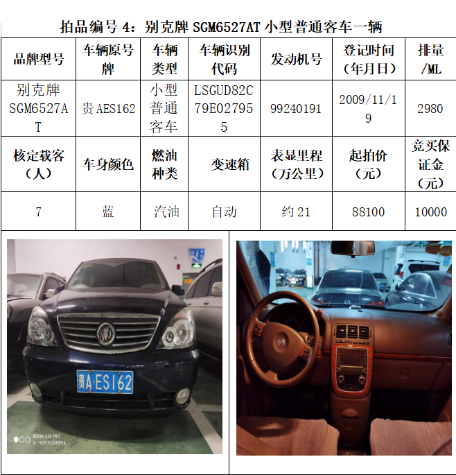受委托,本公司定于2021年3月26日(星期五)下午14:30時(shí),在貴陽(yáng)市中華南路20號(hào)新大陸數(shù)碼廣場(chǎng)10樓D座拍賣(mài)廳公開(kāi)拍賣(mài)以下車(chē)輛:普拉多越野車(chē)1輛、超級(jí)維特拉越野車(chē)1輛、別克商務(wù)旅行車(chē)1輛、輝騰轎車(chē)1輛、途勝越野車(chē)1輛、雅閣轎車(chē)2輛、奧迪轎車(chē)1輛,共計(jì)8輛車(chē)。