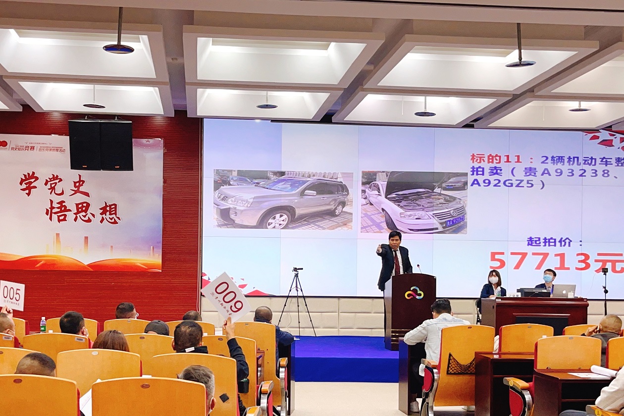 14點,拍賣師宣讀拍賣會規(guī)則及注意事項,拍賣會開始,競買人紛紛舉牌競買,其中2號標的(貴AD6N69東風(fēng)日產(chǎn)轎車、貴A93221獵豹越野車整體拍賣)加價52手,從44,549元一路競爭到96,000元拍賣成交,溢價115.49%,為全場競買最激烈標的。