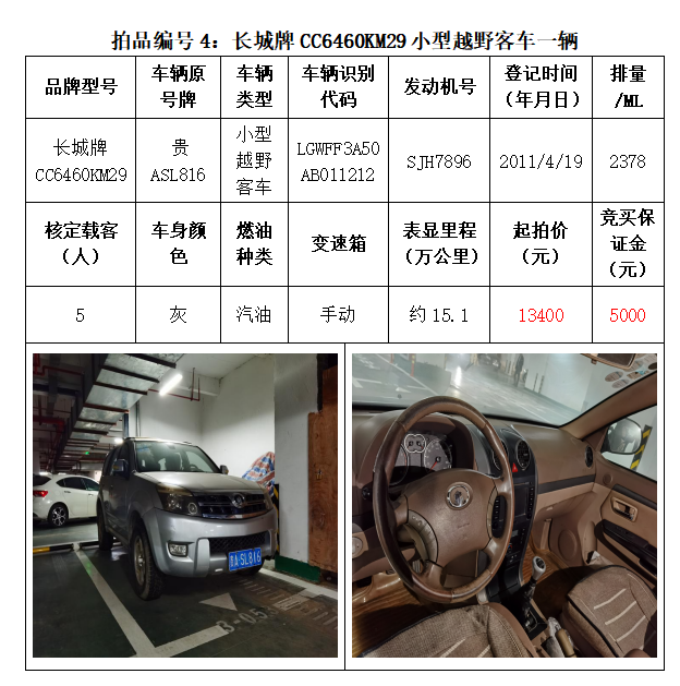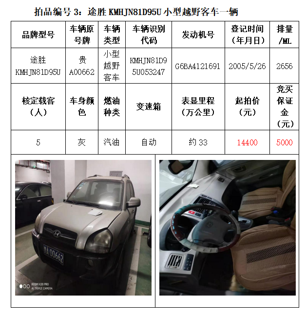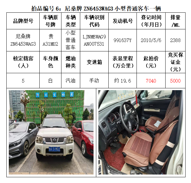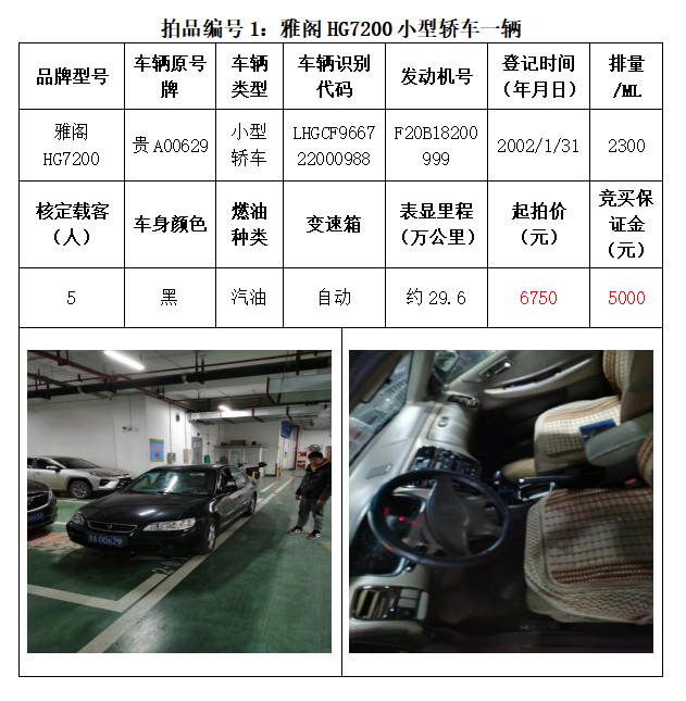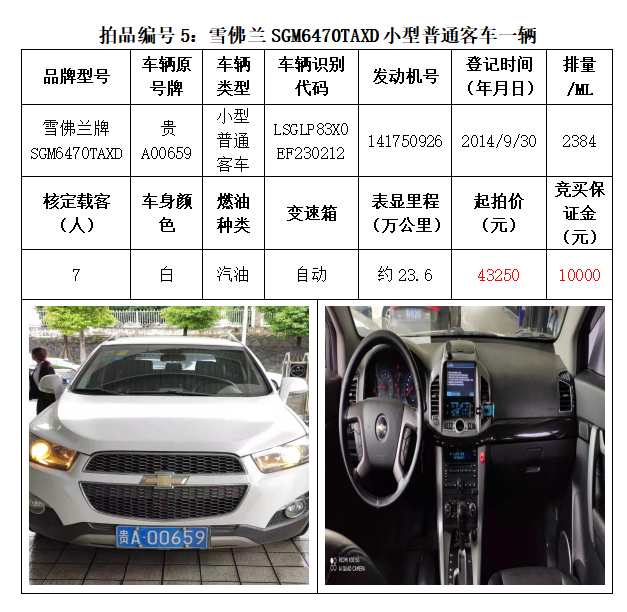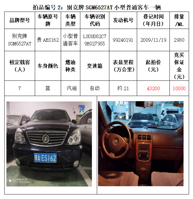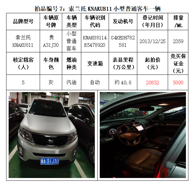 一、拍賣(mài)標(biāo)的:雅閣HG7200小型轎車(chē)1輛、別克牌SGM6527AT小型普通客車(chē)1輛、途勝KMHJN81D95U小型越野客車(chē)1輛、長(zhǎng)城牌CC6460KM29小型越野客車(chē)1輛、雪佛蘭SGM6470TAXD小型普通客車(chē)1輛、尼桑牌ZN6453WAG3小型普通客車(chē)1輛,索蘭托KNAKU811小型普通客車(chē)1輛,共計(jì)7輛車(chē)。