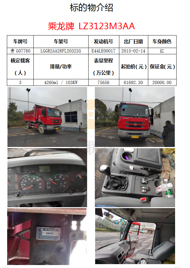 乘龍牌 LZ3123M3AA 貨車 1 輛,車牌號(hào)為貴 G07780 起拍價(jià): ¥ 61692.30 元 保證金:2 萬元